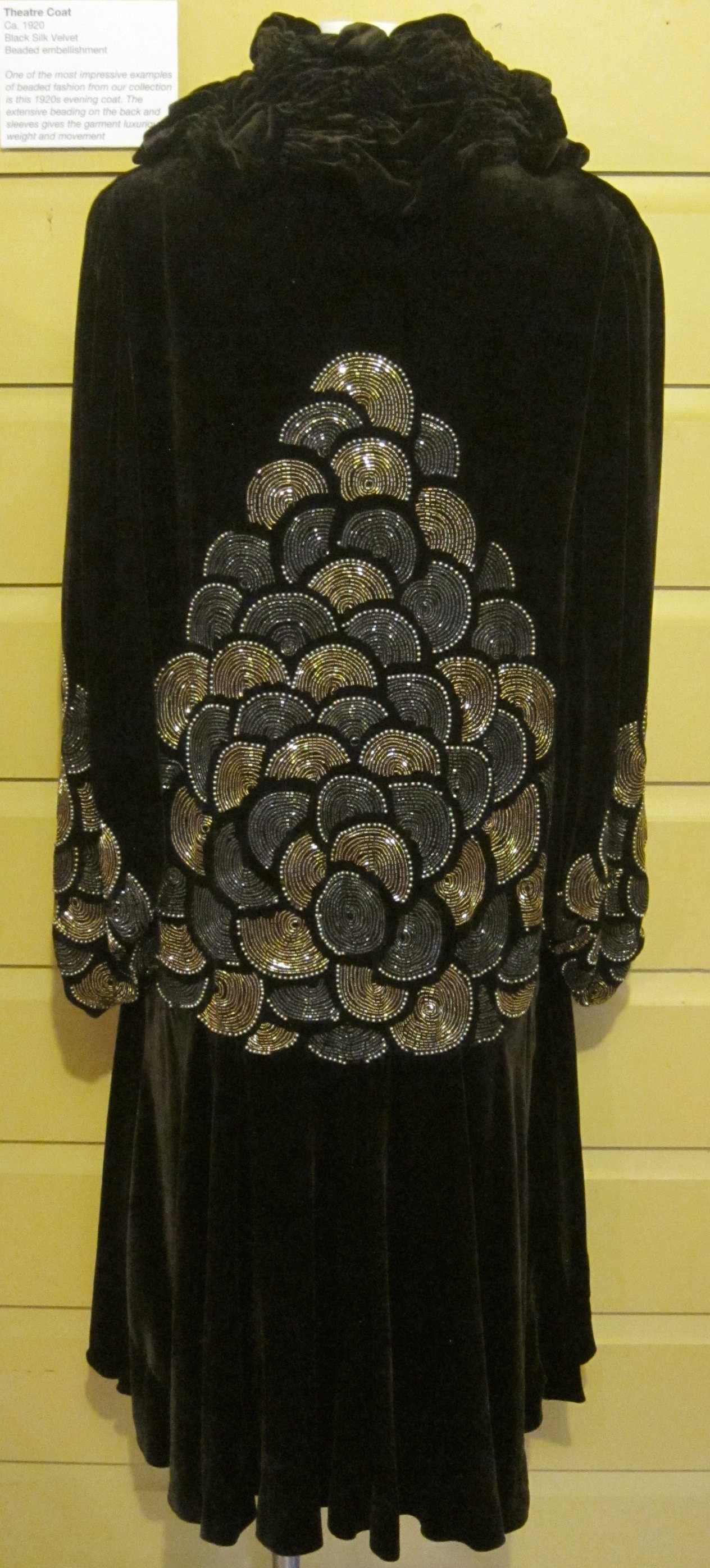 Black silk velvet theatre coat with beaded embellishment, ca.1920.